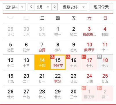 根據(jù)《國務院辦公廳關(guān)于2016年部分節(jié)假日安排的通知》和省政府辦公廳有關(guān)通知精神,2016年中秋節(jié)放假日期新鄉(xiāng)市天豐振動機械有限公司具體安排如下:9月15日至17日放假調(diào)休,共3天。9月18日(星期日)上班。
