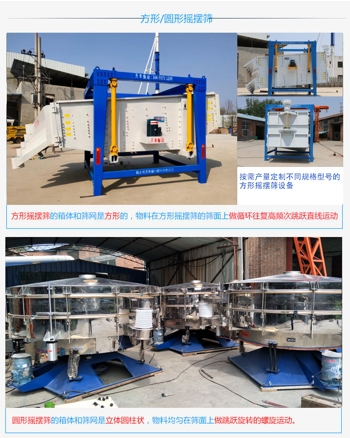 方形搖擺篩的箱體和篩網是方形的,圓形搖擺篩的箱體和篩網是立體圓柱狀的。